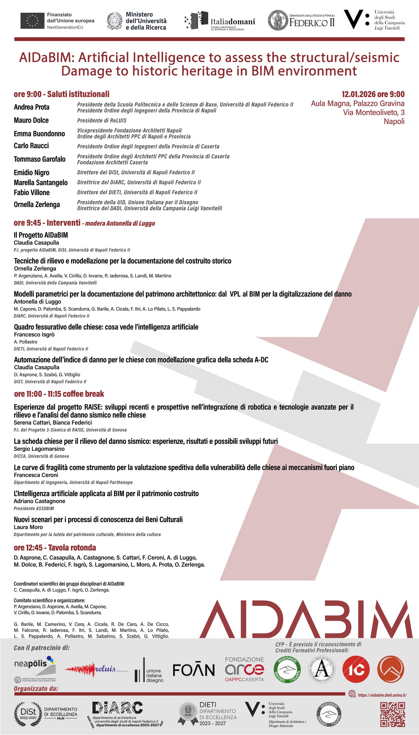 Il workshop ha l’obiettivo di illustrare e discutere i risultati del progetto PRIN 2022 PNRR – AIDaBIM e vede la partecipazione delle due unità di ricerca Unina (DiARC, DIST, DIETI) e Vanvitelli (DADI) che con carattere fortemente interdisciplinare vede applicata l’intelligenza artificiale e la metodologia BIM al patrimonio architettonico religioso. L’iniziativa intende inoltre promuovere il dialogo e il confronto con le istituzioni e le realtà coinvolte in qualità di relatori — Atenei, DPC, MIC, associazioni e ordini professionali — favorendo uno scambio di esperienze e prospettive sui temi della ricerca.