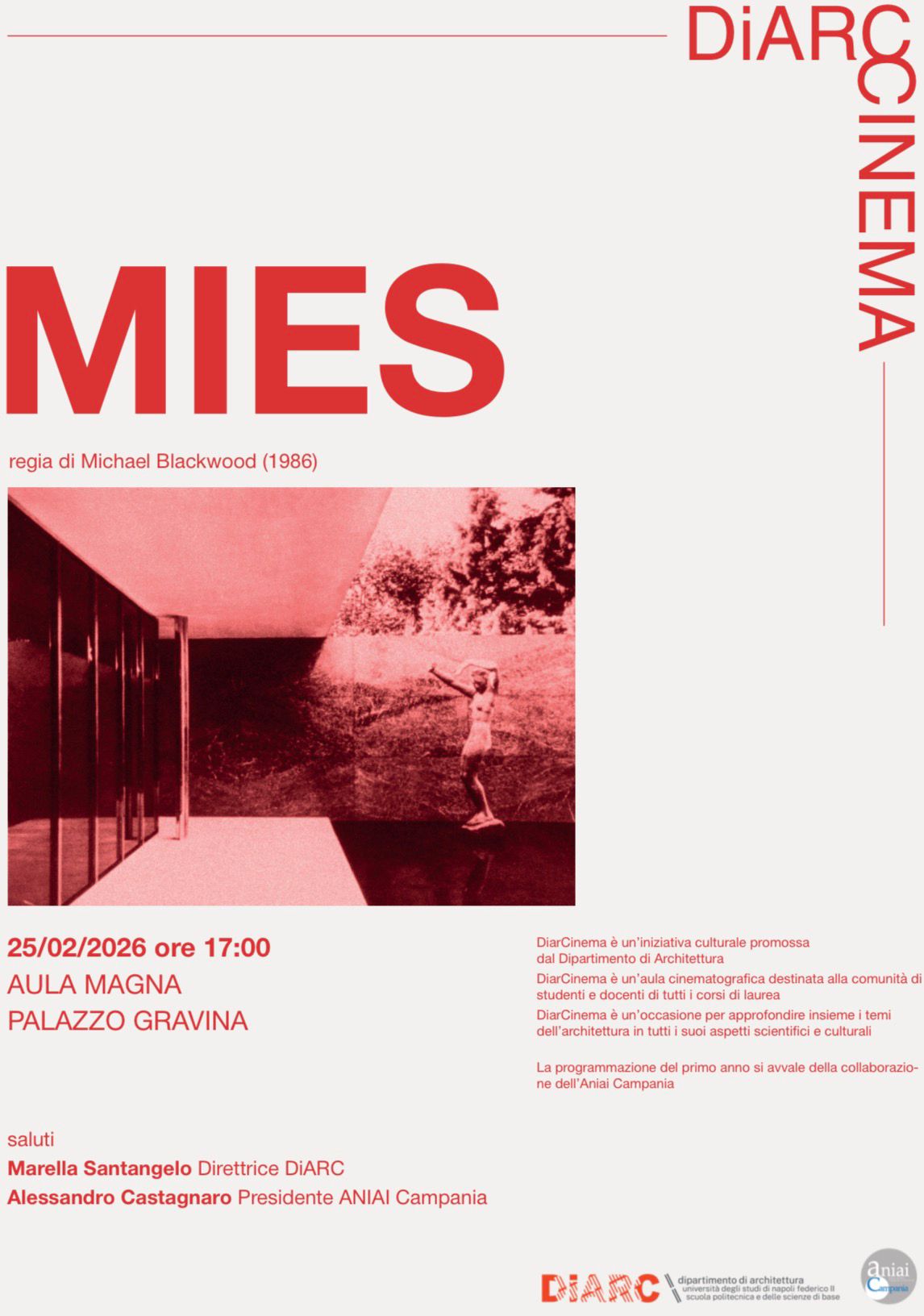 DiarCinema è un’iniziativa culturale promossa dal Dipartimento di Architettura. DiarCinema è un’aula cinematografica destinata alla comunità di studenti e docenti di tutti i corsi di laurea. DiarCinema è un’occasione per approfondire insieme i temi dell’architettura in tutti i suoi aspetti scientifici e culturali. La programmazione del primo anno si avvale della collaborazione dell’Aniai Campania