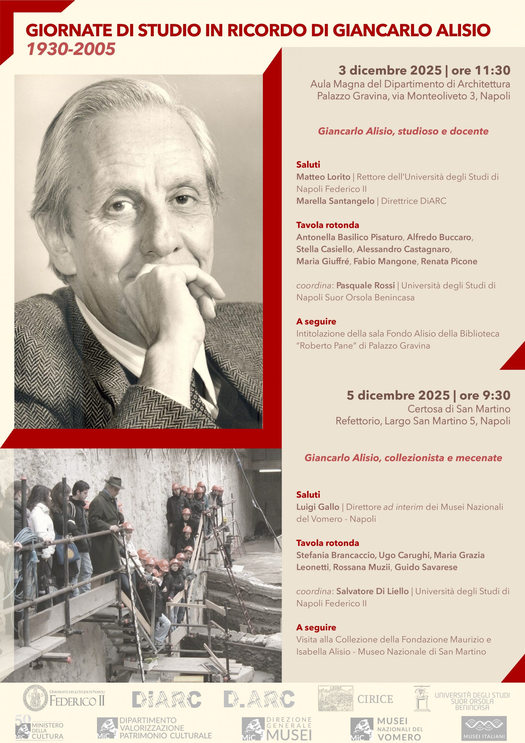 Si invita a partecipare alle due giornate di studio in onore del prof. Giancarlo Alisio che si terranno il 3 dicembre alle ore 11.30, presso l’Aula Magna di Palazzo Gravina, con intitolazione, a seguire, della sala Fondo Alisio della biblioteca “Roberto Pane”, e il 5 dicembre alle ore 9.30, nella sala del Refettorio della Certosa di San Martino, con visita alla Collezione della Fondazione Maurizio e Isabella Alisio.
